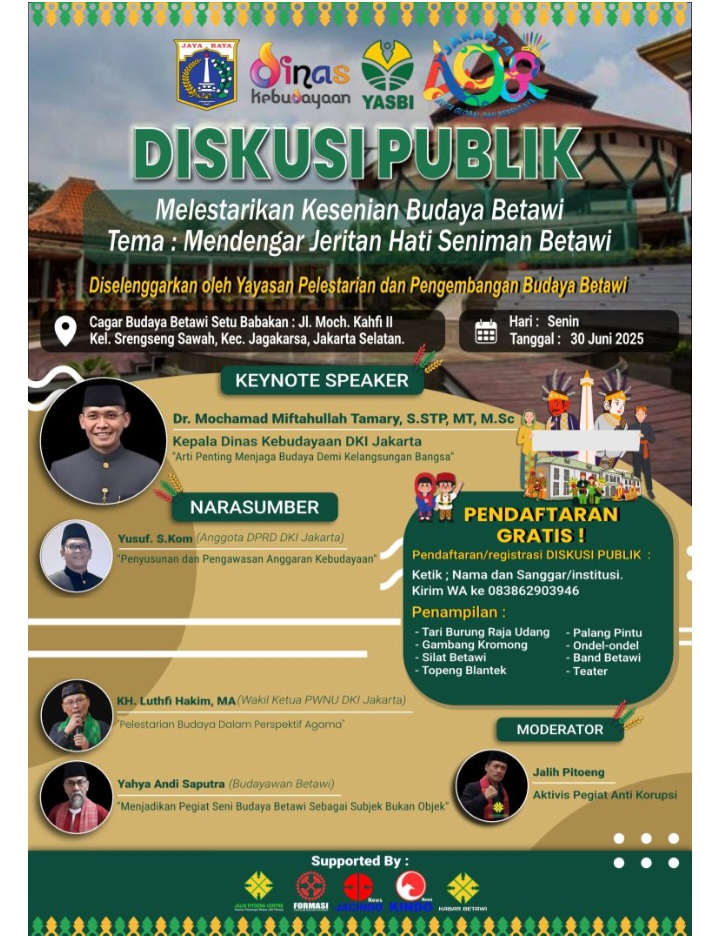Pikiran merdeka.com, JAKARTA 28/6/2025 – Diskusi Publik yang rencananya akan di gelar 30 Juni mendatang di ruang Serbaguna Pusat Perkampungan Budaya Betawi, Setu Babakan, Jagakarsa, Jakarta Selatan, akan menjadi momentum bersejarah dalam kebangkitan para pegiat seni budaya Betawi.