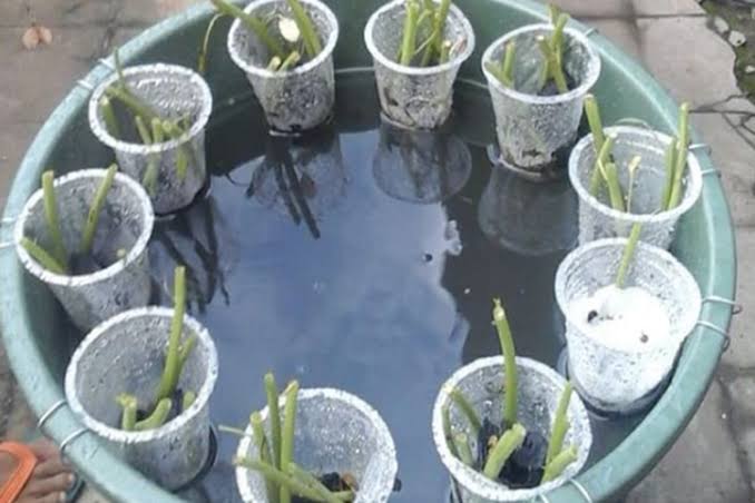 Biarkan bagian bawah gelas menyentuh air, agar akar menyerap nutrisi dari air lele.
