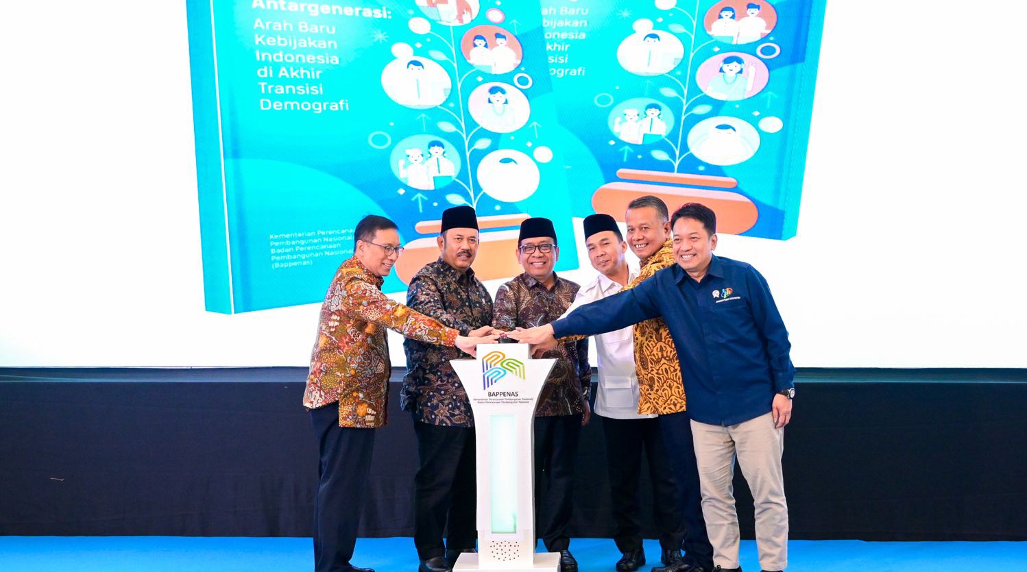 Menteri PPN/Kepala Bappenas Rachmat Pambudy bersama Menteri Koordinator Bidang Pembangunan Manusia dan Kebudayaan Pratikno, Wakil Menteri PPN/Wakil Kepala Bappenas Febrian Alphyanto Ruddyard, serta sejumlah pejabat terkait meluncurkan Buku Investasi Antargenerasi